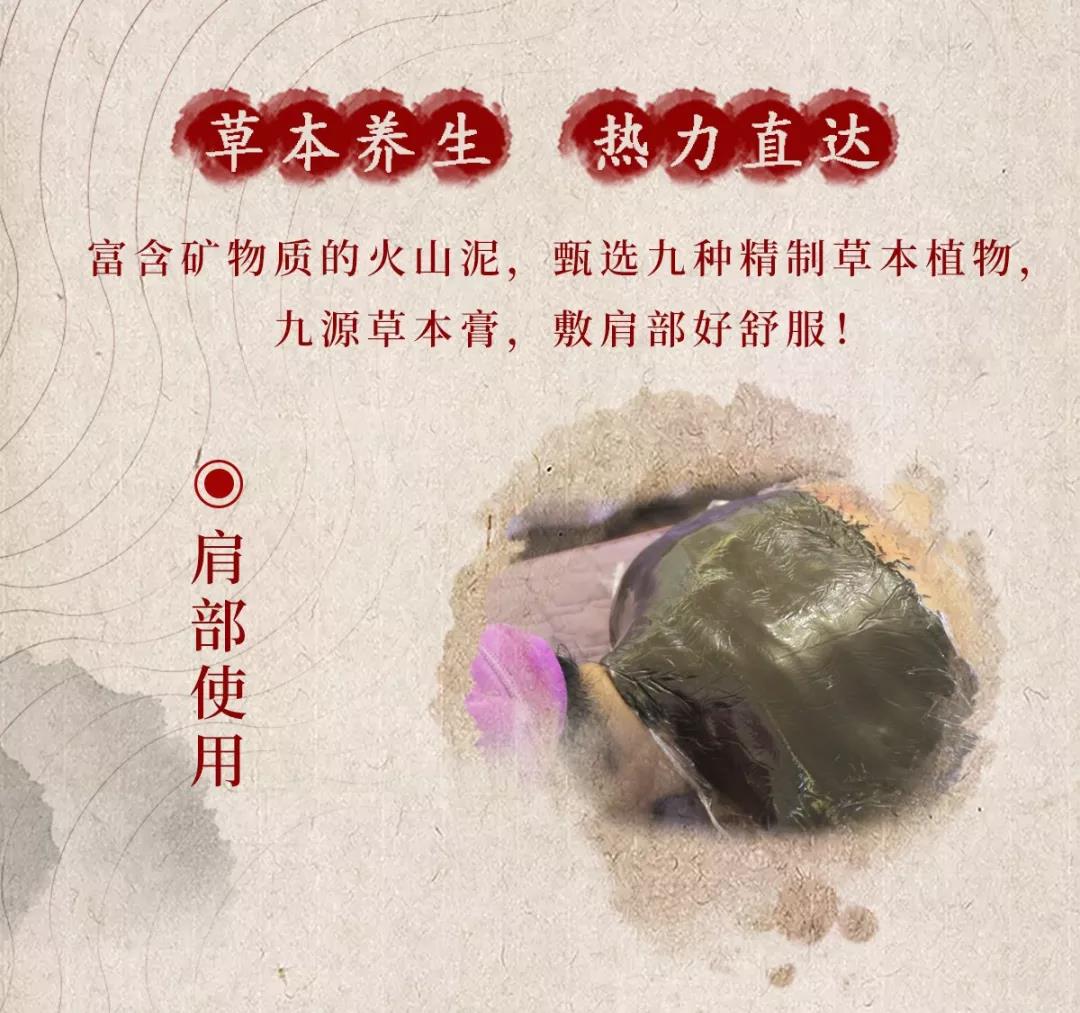 九源草本膏可以敷在身體的很多部位上,比如肩部、背部、腹部、膝蓋、腿部等,溫熱的草本膏敷在酸脹的肩部,