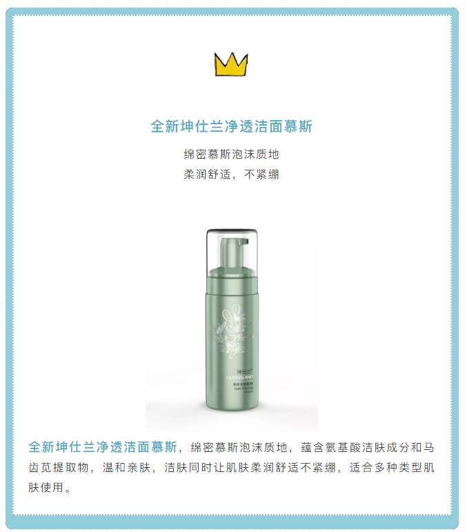 所以我們要換成適合冬天使用的溫和型洗面奶,比如即將上市的全新坤仕蘭凈透潔面慕斯。